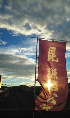 十「初の試み、戦国ご当地グルメ大合戦!では、うんまい食を楽しまれたお客さまの投票によって選ばれし昨夕の中間発表では、我ら上杉軍のご当地グルメが上位を占めました…。最終日の本日、午後2時が投票締め切りです。もちろん結果は気になりまするが、それぞれのご当地ならではの食、たくさん堪能して欲しいです…。同様に日ノ本各地から大集結された甲冑武者さまによる¨出陣行列は午後3時から、そして、春日山城の鎮守、春日神社さまの下、史跡広場で¨かがり火を焚いて行う川中島の合戦の再現…。勇壮な時代絵巻が謙信公祭の取りを飾りまする。強者さまのご武運をお祈りいたします。縁の下の力持ちさま、ご参集のみなみなさま、お身体気を付けて元気な笑顔で¨いざ出陣にござりまする〜」