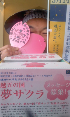 十「渡り鳥さま方は遠〜く北に帰ってしまいまするが、いよいよ3月14日(土)、お江戸は東京駅から最短1時間46分で繋がりまする〜北陸新幹線¨上越妙高駅¨開業!上越、妙高、十日町、柏崎、佐渡¨越五の国¨のみなさま、歓迎の気持ちを今から形にする¨夢サクラ短冊¨をぜひ〜」