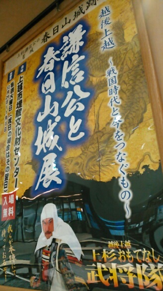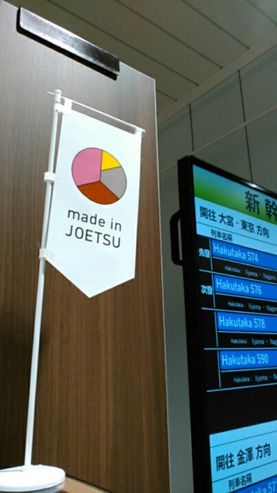 「上越市の認証ブランド!メイド・イン上越!上記などの工業製品、稲作の農業機械、雪国ならではの除雪機械や除雪道具、謙信公の御名前を冠した耐久性のある畳などの情報が上越妙高駅で紹介されています。我らがお館様による本陣の企画展の宣伝も…。東口もてなしドームには、高田城址公園観蓮会の懸垂幕が!北陸新幹線と妙高はねうまラインの上越妙高駅は本日、開業五年と五ヶ月目の記念日です!」