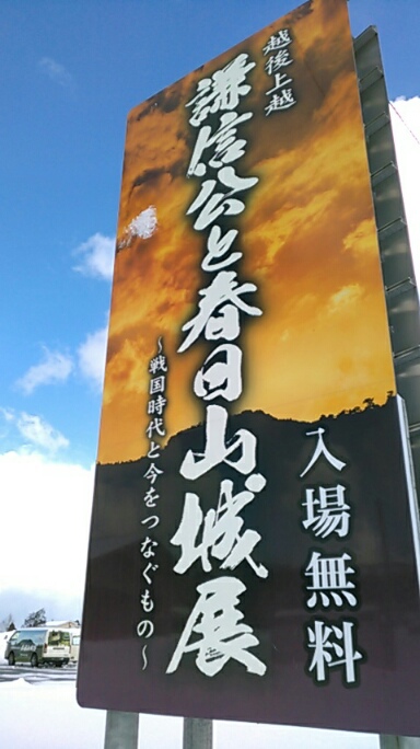 「春日山城跡を、ふるさと越後上越を大宣伝する大きな鉄馬、ラッピングカーを見にぜひ我らが本陣に~!(猛吹雪の合間に嬉しき青空も見えた昨日の画像で~)」