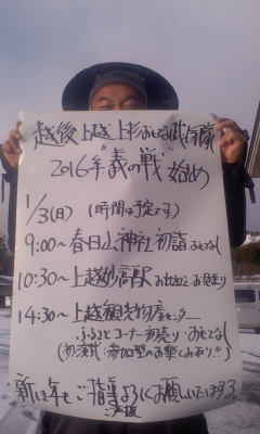 十「お館様¨謙信公が居城¨春日山で、麓にある我らが本陣、無料の企画展¨謙信公と春日山城展¨絶賛開催中の上越市埋蔵文化財センターの前で、はたまた、お祭りや催しの援軍に参陣する道中、信号待ちの鉄馬で、百円ショップなる便利屋さんなどで任務遂行中に、年末恒例、直江津駅でお出迎え、お見送りをさせていただいた昨日は、階段を急ぎ¨お手洗いに向かっていた緊迫した時も、とにもかくにもあちこちで¨暖かいお言葉を頂戴いたしました…。」
