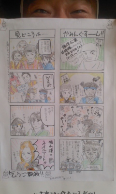 (小さい画像ですが…。)いつも応援してくださっているお客さまよりの「四コマ漫画・謙信公祭ば〜じょん」を〜