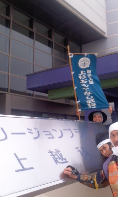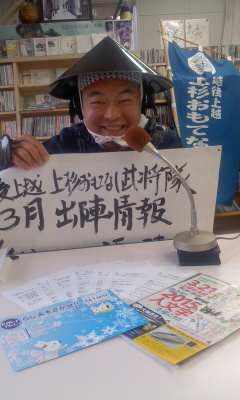 「ならば聴いてくださ〜い。本日は、地元FM-Jさま昼の生放送、月に一度お世話になっておりまする「すまいるカフェ・武将れでぃお」!「遠くに生電話を〜(仮)」は「金澤百万石武将隊」さまのようですよ〜(礼)」
