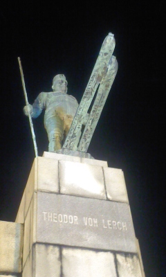 十「何よりお勧めは、スキー発祥50年を機に設置されたレルヒ像ですっ!レルヒウィーク期間の現在は毎晩ライトアップ〜され、冷た〜い空気の中、真下から拝むのが感動間違いなしです〜」
