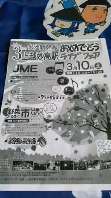 「奥行きある変な顔もありましたが~(汗)!さてさて本日は、沖縄特有の゛さんしん(三線)の日!だそうです…。体験させてもらったことがありまするが上手くいきませんでした。楽器は゛からっかし駄目ですな~!そんな拙者はさておき、軽音楽同好会の高校生さんも大活躍の舞台がありまする!我らが上越妙高駅の開業三周年を祝いての催しです。この10日(土)、東口もてなしドームでは音楽ライブ!自由通路゛脇野田通りでは゛野菜ふるさと市がたちます!春、夏、秋と定期的に開催されて来たみなさまです!上越妙高駅は3月14日で三歳に!もちろん、上越妙高駅が大好きな拙者は゛永遠の二十歳にござりまする~」