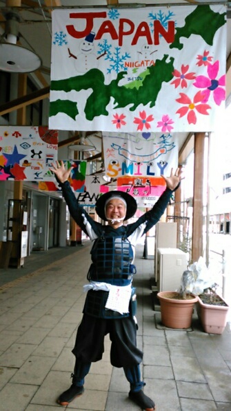 ※金谷山スキー場で大開催される゛レルヒ祭に合わせ、最終日の2月3日まで高田駅前商店街の雁木風アーケードに高田城下の小学生さんが描いた色とりどりの旗が掲げられています~!十吾郎(礼)