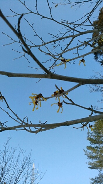 「残雪の里山で黄色い花を付けたマンサクに会いました。まんさく、それぞれの元気な笑顔!満咲くを~(願)」