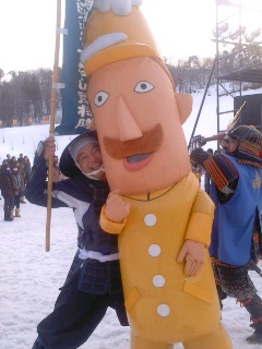 「やって参りました〜レルヒ祭…。本日、日ノ本スキー発祥ゆかりの金谷山スキー場で9時20分、当時の一本杖スキー術披露、地元小学生さんの金谷山太鼓演奏などで開幕されまするっ!」