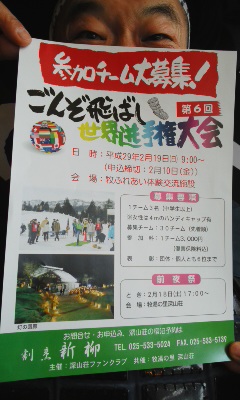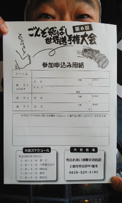 「昨年は…でしたが(汗)、いよいよやって来ます!2月19日(日)は第6回ごんぞ飛ばし世界選手権大会〜!越後は新潟県内でも豪雪地、我らが上越市の山里は牧区の暮らしで使われてきた稲藁で編んだ深靴¨ごんぞ¨を単純明快いかに遠〜くに飛ばすかを競い会う義の戦!参加チーム募集中にござりまする〜!さらに、明後日の5日(日)は第28回¨牧っこ雪まつりの中で¨ごんぞ飛ばしゲームも予定されています。その場で参戦出来、遠くに飛ばせなくとも枠に入れば得点が入る遊び感覚で楽しめるもの…。我らが頸城平野も再び真っ白です。越後の冬を満喫しましょうぞ〜」