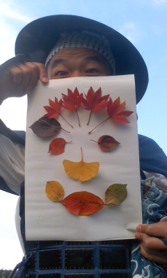 落ち葉でお絵かき・・・。相変わらずご起用ですね。真ん中のは人の顔だとわかるんですが、左のは全然ちんぷんかんぷんです。