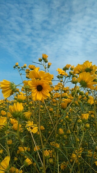 ※昨日は、天気予報を覆し青い空もありがたかったです。観光と物産展で撮り忘れ、退陣の時の空!少し色づいて来た桜!そして、地域のみなさんが手掛け、広がる刈田の道脇に咲き始めたヤナギバヒマワリの写真をお届けします!十吾郎(礼)