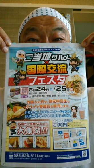 「飲み過ぎはいけませぬ~(汗)!さておき、我らがふるさと越後は新潟県上越市!謙信公が武勇と遺徳を讃え偲ぶ謙信公祭は第94回目を迎えました!さすがに昼から祝い酒とはいきませぬが、地元はもとより県内外から海外からも゛うんまい食が大集合です!各地の武将隊さまも大集合です!あっ、夜8時ではないですが、全員集合でお祝いしましょうぞ~」