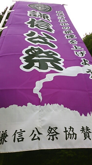 「重さ1t以上の謙信公神輿が朝から巡行されまする!朝9時、謙信公が春日山城跡をはじめ支城跡で狼煙が上がります!夜は♪春日山節!春日山小学校前の謙信公大通りで民謡流しです!みなそれぞれの楽しみ方で、よき一日に~」