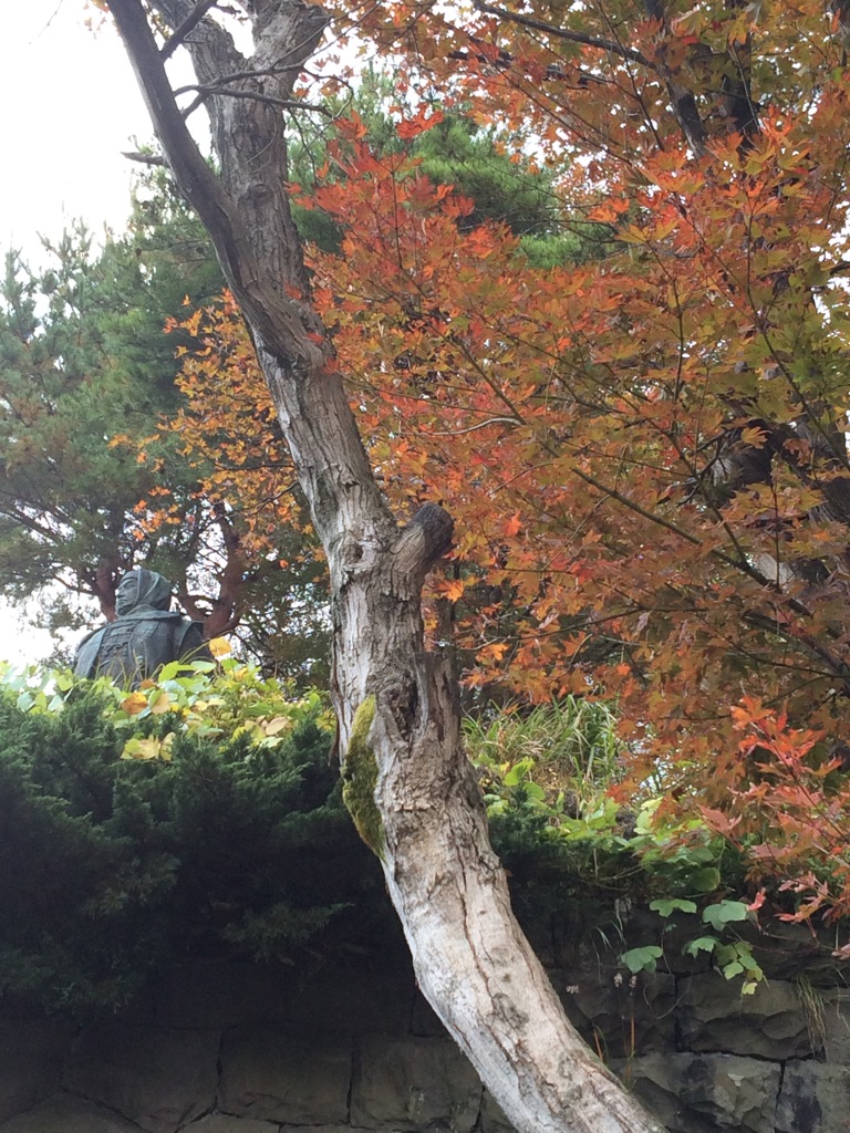 銅像の側の紅葉や…