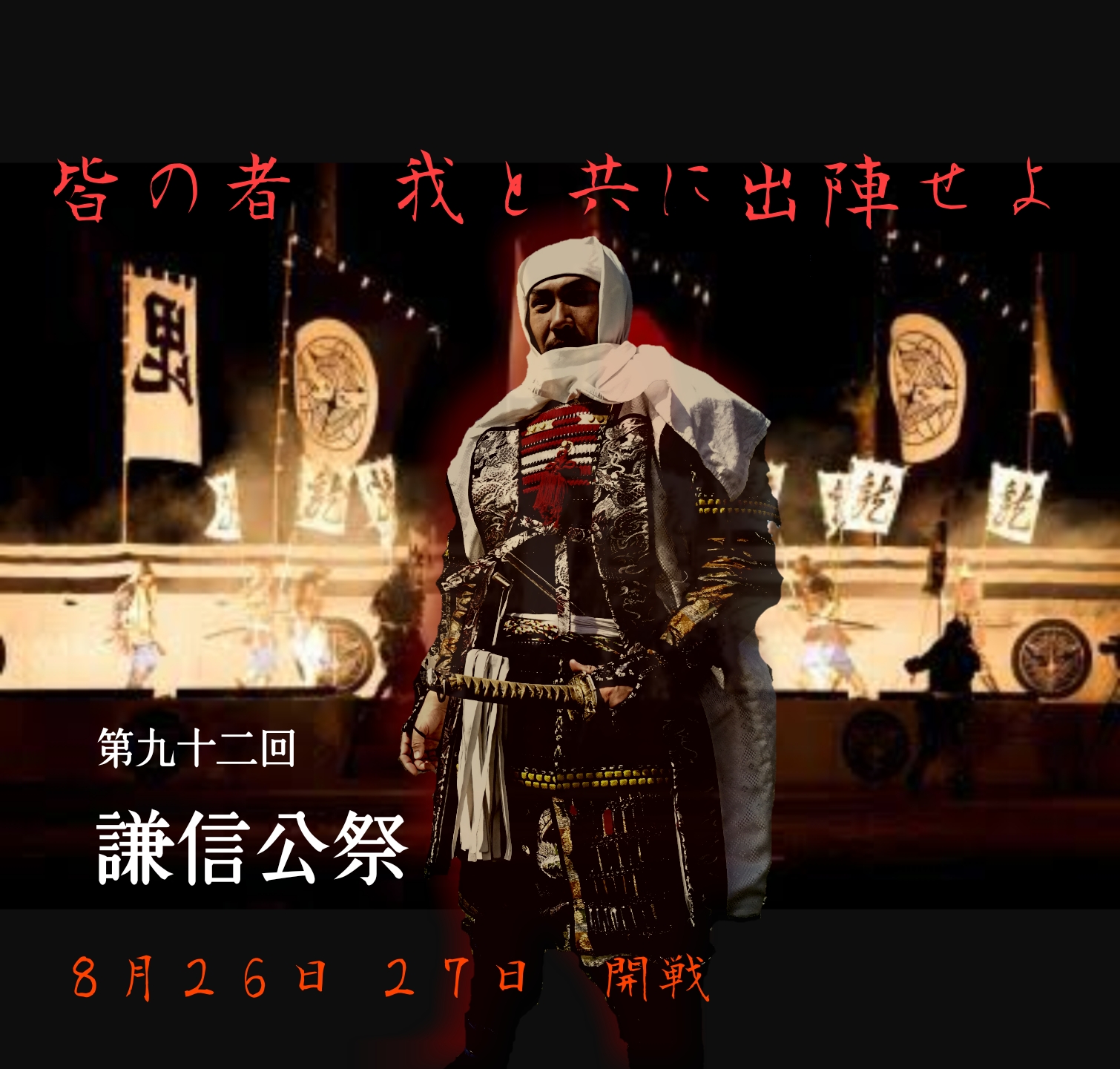 今では400人以上の者達が勇ましい甲冑姿で春日山城下を練り歩く出陣行列や、「鞭声粛々夜河を渡る」と詠われたように、夜篝火をたいて見る幻想的克つ勇壮な川中島合戦の再現と、見処が満載のお祭りなんじゃ!