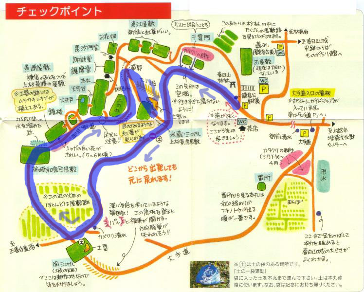 大手道から上がってくる道にぶつかったところを、そのまま南三の丸、柿崎屋敷跡を通り、御成街道→二の丸→三の丸とぐるりと一周するコースである。