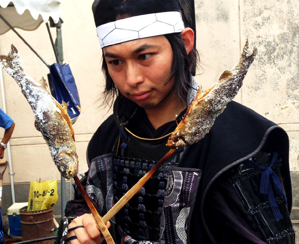 敵を槍で串刺しにする景家殿に対し、今年も串で串刺しのニジマスの塩焼きを頂いてしまい、心躍る景勝。