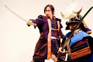 広島県「安芸ひろしま武将隊」の毛利元就公(奥)