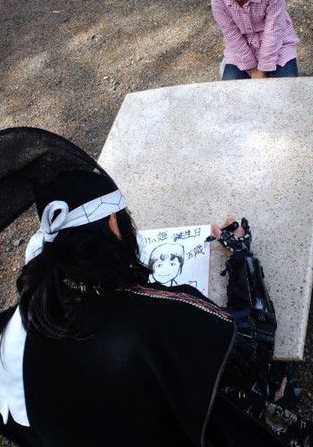 参拝客がいない時間でお願いいたしましたが、10分掛からずに描きあげていただき、改めて画伯武将と感嘆いたしました。