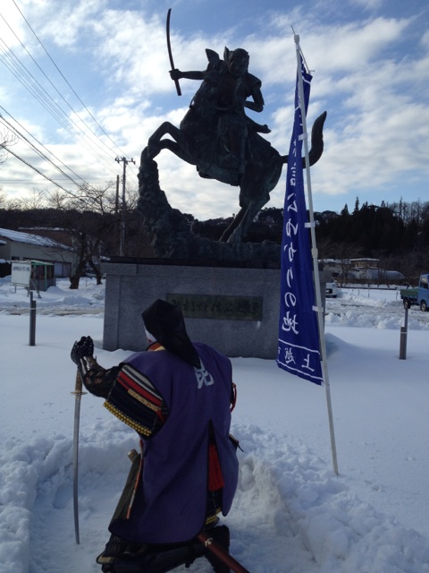 この時期、雪の中に立つお館様のカッコいい銅像と