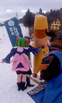 『我が郷で毎秋恒例、儂の名がついた「越後・謙信SAKEまつり」の公式きゃらくた〜歌瀬姉妹どのに、先のレルヒ祭に続き大阪でも、でれでれ〜しておったおぬしの話しでは心もとないが、「酒の陣」には越後一円九十近い蔵元さまが集結されるっ!酒、食、人、楽しみにして欲しいの〜』