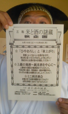 何やら、美味しいお楽しみが…。暑い(暑過ぎですが…)夏を越して熟成が一段落、この時期にしか出回らないお酒「ひやおろし」「秋上がり」をはじめ(いずれも拙者、初めて伺いました…)、上越地域全蔵元の純米酒を試飲出来まるようにござります…。