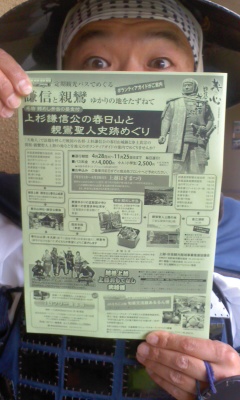 同様に、春日山をお楽しみいただいているツアーなるものもあります…。お隣の妙高からは昨年に続き、「上杉謙信公と親鸞聖人史跡めぐり」と題した、毎日運行されている旅も…。主に遠方からのお泊まりのお客さまがご利用なされ、我ら「武将隊」もたいへんお世話になっておりまする…。