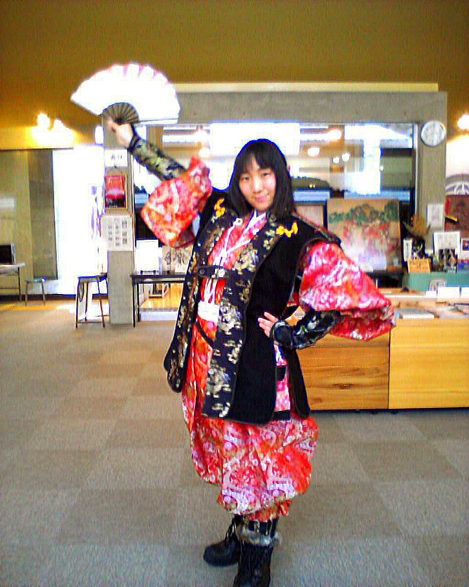私もちょっぴり真似っこして、陣羽織を羽織ってみましたが…お館様から『より桃太郎っぽくなったの〜ぅ』と言われてしまいました…。