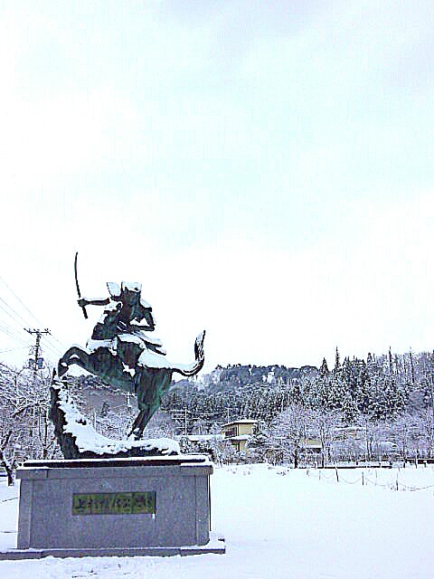 謙信公の騎馬像も雪をかぶって白黒写真が水墨画のごとくでござります。