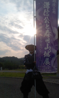 上越市埋蔵文化財センターで絶賛開催中の「謙信公と春日山城展」…。本陣でお客さまをお迎えしようと、お館様が陣幕を背に床机にて、お待ちになっていたところ…。『ぎゃ〜っ!?』と、あの十吾郎…。さらには、午後の演武でも、『???』…。相も変わらず、困ったもんですっ!