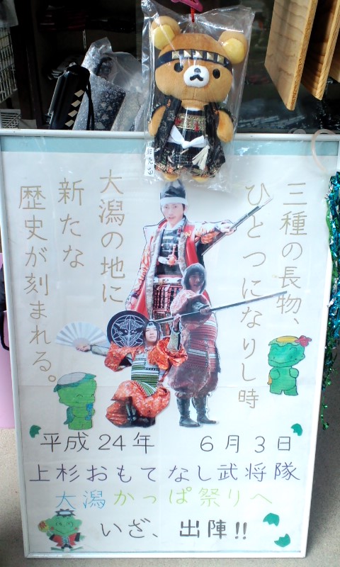 朝一番で大潟より河童様の使者がいらっしゃり…今週末、6月3日に私共がお伺いする『大潟かっぱ祭り』の出陣をお知らせする看板を置いて行かれました!!