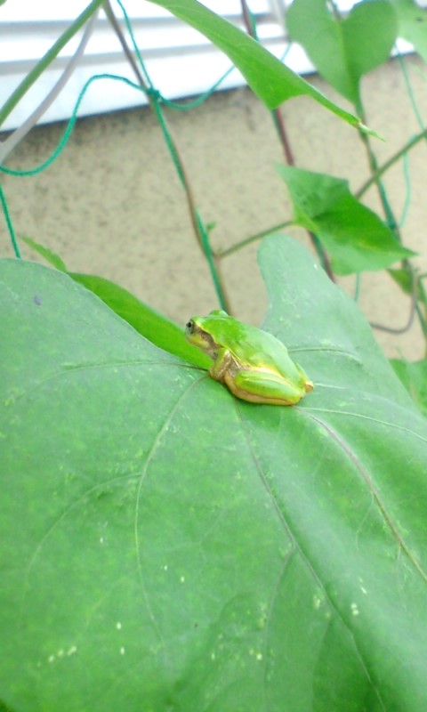 そんな本日、帰り際に成育途中の緑のカーテンをふと見ると…葉っぱに蛙が数匹とまっておりました♪