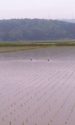 田んぼには、植えられた早苗の合間を仲好く泳ぐ鴨さまが…(この時期はカルガモかな?)。す、すみません、邪魔してしまったようで…。また、長い脚の鷺さまは、悠々と田んぼを散歩中…。